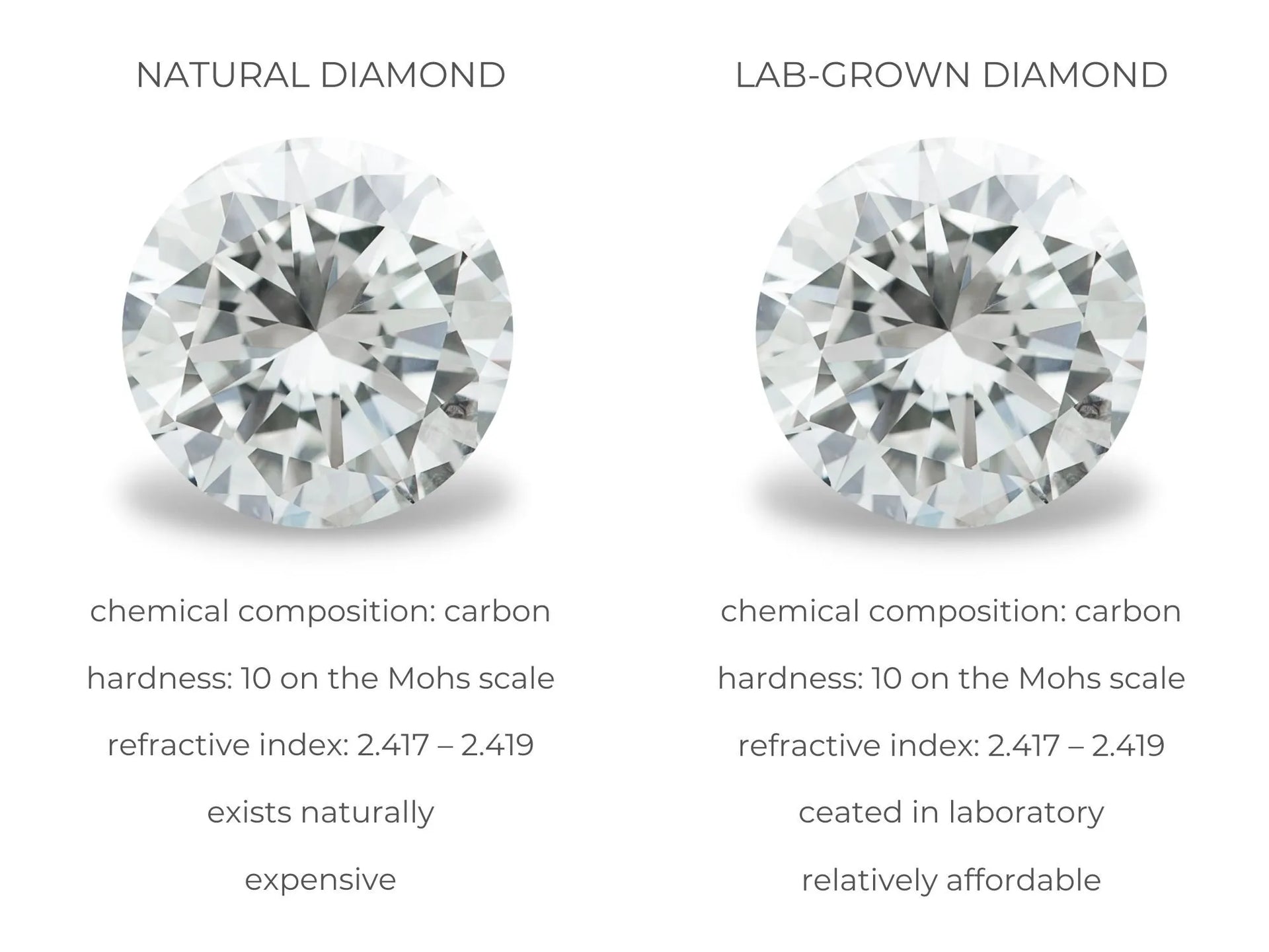 Lab created diamonds are 100% pure, crystallized carbon, which makes them optically, chemically, and physically identical in every way to an earth-mined diamond.